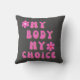 Show your support for women's fundamental rights with this throw pillow design that features "my body my choice" text in pink retro 1970s style font on dark grey background.