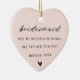Celebrate your bridesmaid and best friend with this beautiful Christmas ornament, a perfect keepsake to honour her special role in your wedding. Featuring a heartfelt message and elegant design, it's a thoughtful way to show your appreciation during the holiday season. Personalize it with her name and wedding date to create a lasting memory she'll cherish year after year.