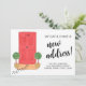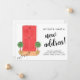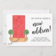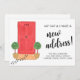 This moving announcement card features a red door and pot plants with kitty paw prints.