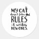 A funny and bold graphic design for cat owners who know their pets are in charge! This typography art features the quote: "My cat doesn't follow rules, it writes new ones." With a cute, stylized cat icon and paw print, it's perfect for t-shirts, mugs, or as wall art to celebrate the playful anarchy of your favourite feline.