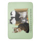 Four Cats grouped together around a cardboard box against a backdrop of green