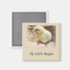 This humourous chic magnet is just that; a refrigerator magnet with a photograph of a baby chicken in a basket of eggs. You can edit or remove the text if desired.