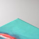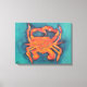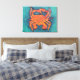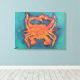 A canvas print offering of an acrylic painting of a crab done in warm orange, red and yellow on a cool background of blues. This beach themed painting with a coastal feel would look great in any room with an ocean theme.