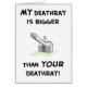 Funny t-shirt design for the Evil Genius in your life. White lab coated Evil Genius / mad scientist stands behind his enormous deathray. MY deathray is bigger than YOUR deathray!