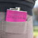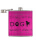 A perfect flask for those who prefer the company of dogs and the comforts of home! This flask design features text that says "I'd go...but my dog wouldn't allow it." with a paw print and dog silhouette embellishment against a magenta wooden background. Additional gift items available with this design as well.