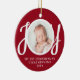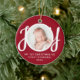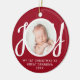 This keepsake "My First Christmas As Great Grandma" photo ornament is decorated with the word JOY in white stylish script typography on a red background. Easily customizable, with your baby's photo.