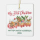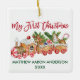 Modern Brush Script My First Christmas Baby Ornament includes Watercolor Gingerbread Train with candy, cookies and pines. Red and Green.