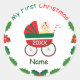 A baby in the baby stroller in red and green, and decorations with “My First Christmas.” Cute and unique Christmas gift for babies to remember your baby's first Christmas.