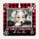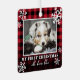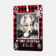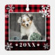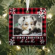 This festive square Christmas ornament is a sweet way to celebrate your dog or any pet’s first holiday season. The design features a bold black and red plaid (buffalo check) background on both sides for a cozy and classic holiday vibe. White snowflakes surround the photo and text on each side, with playful paw accents that add a fun, pet-loving touch.