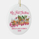 Modern Brush Script My First Christmas Baby Ornament includes Watercolor Gingerbread Train with candy, cookies and pines. Pink.