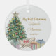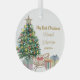 My First Christmas holiday ornament keepsake with new baby name and date of birth. The design features a lit christmas tree with crib and gift wrapped presents. Perfect keepsake gift for a new baby.