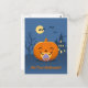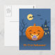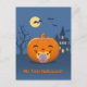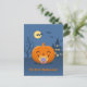 Adorable baby Halloween pumpkin with a pacifier. A dead tree, a creepy mansion, some bats, and the moon are seen on the background.