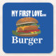 My First Love Burger Square Paper Coaster designed by Nisha Prabhu. Featuring yummy delicious Burger graphic digital illustration with funny typography ''My First Love...Burger.'' Add a touch of nostalgia and charm to your dining experience with our First Love Burger Square Paper Coaster! Featuring a delightful design inspired by classic diners and retro vibes, this coaster is perfect for keeping your table clean and your memories fresh. Get yours today and enjoy a taste of the good old days with every sip!