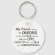 "My friend told me that onions are the only food that can make you cry. Until I hit him in the face with a watermelon!" This key chain is customizable, so you can personalize it with a name or your own text, if you wish.