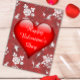 Introducing our exquisite, 'My Heart Beats for You' Valentine's Day Card, a radiant expression of love and affection that goes beyond words. This beautifully crafted card is designed to captivate the heart, making it the perfect way to convey your deepest emotions on this special day. The front of the card features a stunning, large red gel heart that instantly catches the eye. 'Happy Valentine's Day' is elegantly scripted across the heart, ensuring your message of love is front and centre. The rich red hue adds warmth and passion to the card, setting the tone for a romantic celebration. Beneath the heart, a delicate white lace pattern of roses unfolds, adding a touch of timeless elegance. Each intricate detail is thoughtfully crafted, creating a visual masterpiece that symbolizes the beauty of your relationship. The lace motif serves as a poetic backdrop, enhancing the card's overall charm. Inside the card, you'll find ample space to pen your own heartfelt message on the left side of the open card. On the right side, there is the fun, 'My (love heart) beats for you' message. All can be personalized if you'd rather change it to your own unique message of love. Whether you're celebrating a new romance or cherishing years of shared memories, this Valentine's Day Card is a timeless gesture that speaks volumes.