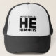 My Pronouns are He Him His Square trucker hat stated in black, big and bold.