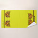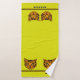 This thick, velvety towel set features a cute cartoon style tiger cub's face in orange & black tiger on a bright puce (yellow-green) background w/ alternating black & orange borders above a wide puce band at bottom. Bath size is ready to personalize w/ your (or your kid's) name, hand towel has space for a monogram, washcloth has initial.