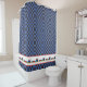 This whimsical design is for train lovers, you and old. This shower curtain has a background design made up of a blue and brown print pattern, featuring brown squares. On the bottom there is a white band with red trim and a toy train. My Train also has a matching bath mat, bath towels and bath set.