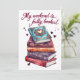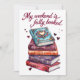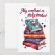 A cozy book lover quote celebrating weekends spent reading. Decorative stacked books with hearts create a warm and relaxed reading mood for people who love quiet time with stories.