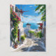 Romantic cartoon style photorealistic illustration from a street with sea view on a mountain in Mykonos island of Greece