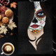 A striking and elegant sugar skull portrait featuring a woman’s face emerging from deep black shadows. Intricate Día de los Muertos–inspired details, vivid eye makeup, and floral symbolism create a powerful balance of beauty and mystery. The dark background enhances the bold contrast.