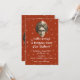 This flat card party invitation is red with white twinkle like stars and a sepia photograph of a mysterious magical Genie head who is wearing a turban with a jewel and feather. Customize your information with the templates.