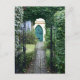 Open gate leading you up the garden path to a green gothic arch door surrounded by a hedge