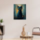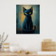 A stylized digital painting of a black cat with piercing yellow eyes, seated against a moody abstract background of teal, blue, and orange. The expressive brushstrokes and shadowy tones evoke mystery and elegance. This piece blends realism with atmosphere, perfect for lovers of feline art and dark aesthetics.