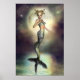A blonde mermaid with a shimmering tail of green and yellow is in front of a full moon on a mystical background above the ocean water. Enjoy!