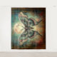 A large moth with intricate patterns on its wings is displayed prominently against a backdrop of a full moon. The moth's wings are predominantly teal and grey with hints of pink, while the moon is a pale yellow. The background features a swirling pattern in muted greens and blues, reminiscent of a night sky.  The moth itself has multiple eyespots on its wings, creating a mystical and captivating image.