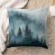 "cool tone palette, misty forest illustration, cozy accent pillow, enchanted blue theme",