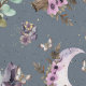 Mystical lavender watercolor anemone flowers with boho crescent moon, bewitching potion bottles, amethyst crystals, and whimsical butterflies create a wonderland of nature. All on a slate grey kraft paper inspired background with dark grey paint splatters and drips of gold ink.