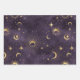 Mystical celestial wrapping paper sheets featuring a deep purple background and gold moon and stars in various designs.