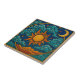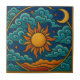 Gaze upon the celestial dance with this mesmerizing decorative tile, featuring a vibrant sun, crescent moon, and swirling clouds against a deep cosmic blue. This ceramic accent piece beautifully captures the harmony of day and night, adding a touch of mystical charm and bohemian wonder to any room. Perfect for creating a focal point that inspires awe and contemplation. Immerse your surroundings in celestial beauty with this exquisite tile. This intricately designed tile showcases a brilliant orange and yellow sun at its centre, encircled by cool blue and turquoise clouds, a serene crescent moon, and twinkling stars, all set against a rich indigo sky. The golden border with elegant corner details and the sweeping arc element perfectly frame this ethereal scene. The vibrant sun, crescent moon, and swirling clouds makes its rich colours and intricate design create a truly enchanting statement. An ideal decorative accent for home decors seeking a free-spirited ambiance.