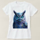 Let your spirit soar with this breathtaking work of art. This tee features a majestic and highly detailed fantasy owl, gazing forward with piercing, vibrant turquoise blue eyes that hold a universe of secrets. Its deep blue and purple feathers are intricately decorated with subtle, shimmering gold mandala and geometric patterns, giving it a truly magical and spiritual feel.