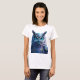 Vibrant Colour Palette: Rich shades of blue, purple, and indigo pop against the clean white tee, with striking turquoise eyes.