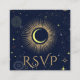 Celestial mystical personalized QR code wedding response enclosure card featuring galaxy milky way midnight sky with star dust, crescent moon and other astrological symbols in navy blue and golden colours. This card is easily editable. If you need help with the customization of this card or you need more matching products for this collection kindly message me via Zazzle.