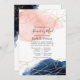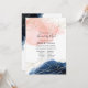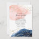 Trendy long distance baby or bridal shower by mail invitation featuring navy blue and blush pink watercolor paint splashes and a gold geometric frame.