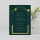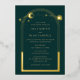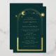 Mystical Green Gold Sun Star Moon Astronomy Space Foil Wedding Invitations features sun, moon and stars with a gold frame on a green background. Inside is your custom wedding invitation information. Personalize by editing the text in the text boxes. Designed for you by ©Evco Studio www.zazzle.com/store/evcostudio