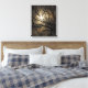 This wrapped canvas print features a mystical nighttime sky. The air is permeated with mist. The full moon shining through the trees lights up the misty clouds in shades of gold, yellow orange, white and brown and forms an interesting abstract pattern.