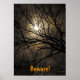 This Halloween poster features a mystical nighttime sky. The air is permeated with mist. The full moon shining through the trees lights up the misty clouds in shades of gold, yellow orange, white and brown and forms an interesting abstract pattern. The text reads: Beware. It can be customized to suit your needs.