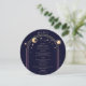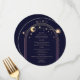 Mystical Rainbow Dark Navy Blue Sun Moon Stars Space Cosmic Astronomy Celestial Wedding Menu Cards features a golden sun, moon and stars frame on a dark navy blue background with your menu details in the centre in modern peach calligraphy script. Personalize by editing the text in the text boxes provided. Designed by ©2024 Evco Studio www.zazzle.com/store/evcostudio