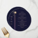 Mystical Rainbow Dark Navy Blue Sun Moon Stars Space Cosmic Astronomy Celestial Wedding Menu Cards features simple golden stars on a dark navy blue background with your menu details in the centre in modern peach calligraphy script. Personalize by editing the text in the text boxes provided. Designed by ©2024 Evco Studio www.zazzle.com/store/evcostudio