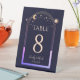 Mystical Rainbow Dark Navy Blue Sun Moon Stars Cosmic Galaxy Astronomy Celestial Wedding Table Numbers Pedestal Sign features a rainbow coloured sun, moon and stars frame on a dark navy blue background. Inside is your custom table number information. Designed for you by ©2024 Evco Studio www.zazzle.com/store/evcostudio