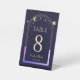 Mystical Rainbow Dark Navy Blue Sun Moon Stars Wedding Table Numbers Pedestal Sign features a rainbow coloured sun, moon and stars frame on a dark navy blue background. Inside is your custom table number information. Designed for you by ©2024 Evco Studio www.zazzle.com/store/evcostudio