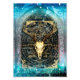 A golden stag skull bust over a burnished star chart background, framed by a mystical forest archway.
