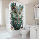 A vibrant, symmetrical depiction of a majestic owl, intricately designed with colorful swirling patterns and intricate details. The owl's eyes are large, glowing in shades of emerald green, framed by vibrant feather-like motifs in hues of turquoise, teal, and orange. The feathers appear as a blend of abstract shapes and ornate, paper-cut style elements that enhance the image’s artistic and surreal appeal. The owl embodies a sense of wisdom and mystery, making it a captivating, decorative image suitable for various merchandize. Owl Art