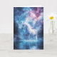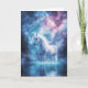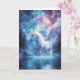 A stunning white horse stands majestically in a mystical, starry landscape. Surrounded by an ethereal glow of swirling cosmic colours in shades of blue, purple, and pink, the horse gazes into the distance. Its flowing mane and reflection in the shimmering water below add to the dreamlike, otherworldly atmosphere. Snow-capped mountains loom in the background, completing this surreal scene of beauty and tranquillity.