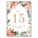 Chic floral table number cards feature a frame of watercolor flowers winter flowers, poinsettia and berries, framing your table number in white. Personalize with your names and wedding date, or name each table for an extra personal touch.