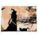 Magical setting for Halloween. A backdrop with a colourful purple-blue, cloudy, night sky with stars and an orange, full moon that has the silhouettes of the a witch, a cat, bats, and a dormant tree.
